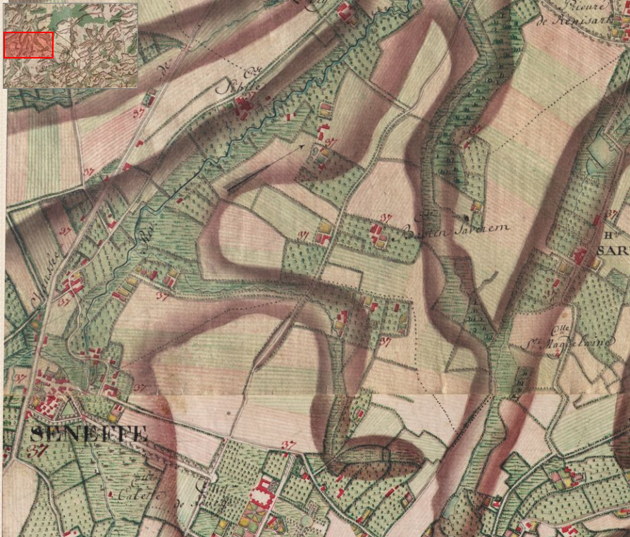 Le découpage est vertical, et le territoire de la commune de Seneffe figure principalement sur les feuillets 80 (“Seneffe”) et 64 (“Rœulx”).